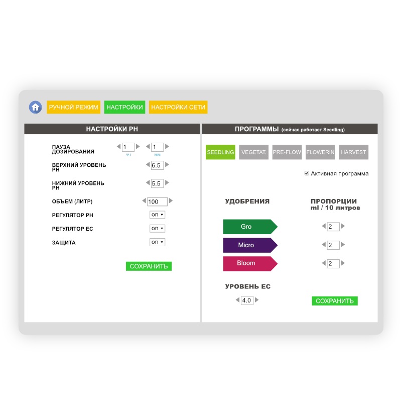 • Программы: Рассада, Вегетация, Предцвет, Цветение, Урожай, Подготовка